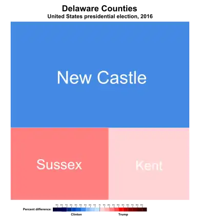 Clinton carried the state with 53.4% of the vote to Trump's 41.9%, a victory margin of 11.37%.[2] Although Democrats continued their streak of winning Delaware, a state that has not gone to the Republicans in a presidential election since 1988, it swung 7.19% to the right relative to 2012, and Trump managed to flip Kent County. This was the first time since 1968 that Delaware did not vote for the same candidate as neighboring Pennsylvania.