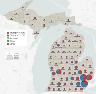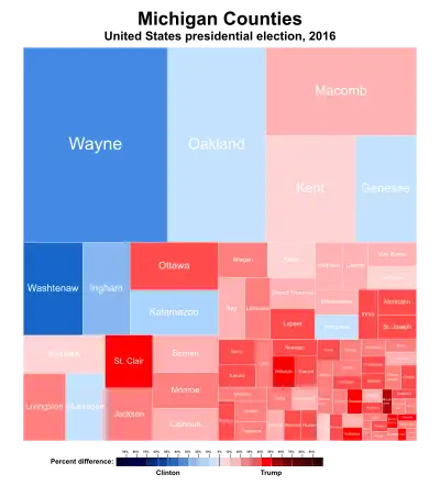 Michigan's largest county, Wayne County, home to Detroit, voted for Clinton by 37 points. She also managed to hold on to suburban Oakland County, the state's second-largest county, where residents tend to be more diverse and more white-collar, where instead third-party candidates gained votes, whilst Trump flipped the state's third largest county, Macomb County, which is home to more socially conservative but economically populist white blue-collar workers.