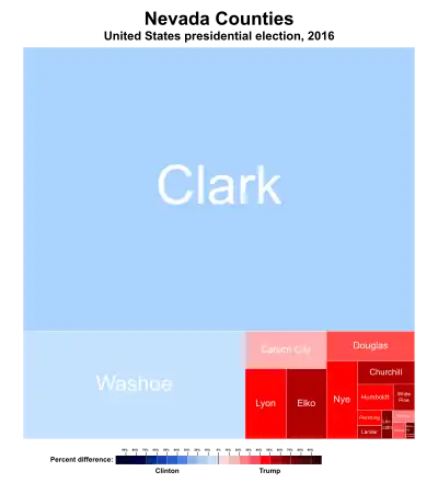 Hillary Clinton won the state over nationwide winner Donald Trump, marking the third presidential election in a row that Nevada has voted Democratic. Most counties in the state of Nevada are rural, and voted heavily for Trump. As a whole, the rural counties outside of Las Vegas and Reno gave Donald Trump a 66-27 margin. However, Clinton won the state's two most populous counties, Clark County and Washoe County, which contain about 85% of the state's population, and thus won the state's electoral votes. Compared to 2012, Clinton's margin of victory was narrower in these two counties and statewide.