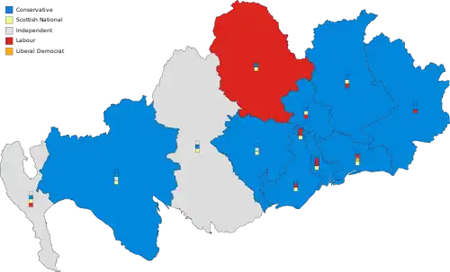 - †††††On 25 October 2019, Mid Galloway and Wigtown West Conservative Cllr Graham Nicol died suddenly. A by-election was held on the 23 January 2020.[7] The seat was won by Jackie McCamon of the Conservative party.