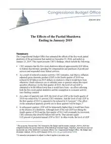 A January 28, 2019 Congressional Budget Office report estimated that the 35-day partial government shutdown cost the American economy at least $11 billion, including $3 billion in permanent losses; the CBO estimate excluded indirect costs that were difficult to quantify.[4] The furloughing of 145,000 federal workers and 112,500 federal contractors in the Washington Metropolitan Area cost the regional economy $119 million each day, or 7.3% of the region's total output.[161] That reduced GDP by over $2.8 billion in the Washington DC area alone.[161] The shutdown also had a noticeable impact on hunger in the national capital region: food pantries in Washington DC and Northern Virginia reported an increase of around 10% in the number of people coming to pick up groceries, with most of that increase coming from federal workers and contractors.[162]