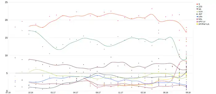 - ↑ "Party ratings see support drop for Harmony, grow for newcomers". Public Broadcasting of Latvia. 1 October 2018. Retrieved 1 October 2018.