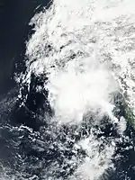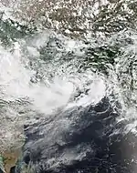 On August 13, a low formed in the northwestern Bay of Bengal from a circulation that was present for the prior four days. The system organized as it moved west-northwestward toward the Indian coastline, becoming a depression on August 15 near the coastline of Odisha, with winds of 45 km/h (30 mph). The depression progressed across central India, weakening into a low on August 17 over Madhya Pradesh. Along its path, the depression dropped heavy rainfall, with a peak 24 hour total of 400 mm (16 in) in Bhopalpatnam in Chhattisgarh state.[3] In Odisha, the heavy rainfall prompted the cancelation of Independence Day activities at schools.[48]