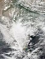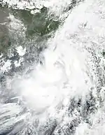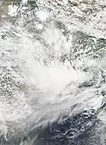 A monsoonal low formed on July 19 in the northern Bay of Bengal. With favorable conditions such as warm water temperatures, the system gradually organized, becoming a depression on July 21 just off the coast of eastern India. The system only attained peak winds of 45 km/h (30 mph), as it soon after moved ashore the Indian coastline near the borders of Odisha and West Bengal. Continuing to the northwest, the depression maintained a flow of moisture that helped sustain its intensity for 36 hours over land, before the system weakened into a low on July 23 over Jharkhand. The depression dropped torrential rainfall over eastern India, reaching as far west as Rajasthan. The highest 24 hour total was 620 mm (24 in) in Burla in Odisha, resulting in flooding.[3] Flood-related incidents killed five people in Odisha.[46][47]