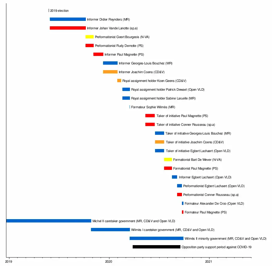 During the formation period, no less than six new governments needed to be formed: a new Federal Government and five new regional governments (Flemish, Walloon, French Community, German Community and Brussels). The elections had shown again the significant differences in voting preferences between Wallonia (left) and Flanders (right). While the Government of the German-speaking Community was formed only a few days after the elections and the Brussels Government was formed one month later, the other regional governments were only formed after the summer, in September and October 2019. At the federal level, the deadlock was never resolved, but nevertheless, a new government was formed in March 2020. Its mission is only to fight against the coronavirus,[1] as several of the opposing parties agreed to support a new Wilmès II Government identical to the current caretaker Wilmès I Government to overcome the COVID-19 pandemic in Belgium, de facto ending the search for a new government. The new government was given special powers to deal with the COVID-19 crisis.[2] The powers expired on 27 June 2020.[3] Efforts to form a coalition continued during this time.[4] The Wilmès II government continues in office in the meantime, but would have to seek a new vote of confidence on 17 September 2020 in case a new coalition was not formed before then,[5] although this period was further extended to 1 October 2020.
