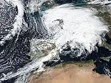 The precursor to Storm Bernardo was first noted as a deep low over north-eastern Canada on 7 November.[57] After considerably weakening and crossing the Atlantic without any notable impacts, the system was named Bernardo by the State Meteorological Agency of Spain (AEMET) on 9 November as it was approaching the Iberian Peninsula from the Bay of Biscay.[15] Bernardo crossed northern Spain and emerged into the Mediterranean Sea, affecting the Balearic Islands on 10 November with wind gusts of up to 111 km/h (69 mph; 60 kn) recorded in the Alfabia Mountains along the north-west coast of Mallorca.[58] On 11 November, Bernardo strengthened to its peak intensity of 996 mbar (29.4 inHg)[59] and formed an eye-like feature, leading several media outlets to report that the storm had medicane-like characteristics.[60] However, AEMET did not confirm that the storm had reached medicane status.[58]