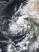 Throughout the second half of August, an upper-level low progressed eastward from the southeastern United States to Bermuda, southward to Puerto Rico, and westward across Hispaniola and Cuba. A weak and broad area of low pressure formed near western Cuba on August 30 and drifted slowly west across the Gulf of Mexico. Deep convection coalesced within curved bands around the center, leading to the formation of Tropical Storm Fernand around 12:00 UTC on September 3. Despite the influence of moderate east-southeasterly wind shear, the cyclone attained peak winds of 50 mph (85 km/h) by early on September 4 before beginning a steady weakening trend. Fernand progressed south of a ridge over the south-central United States, making landfall about 30 mi (50 km) north-northeast of La Pesca, Tamaulipas, at 15:30 UTC on September 4. It weakened quickly once inland and dissipated over the rugged terrain of Mexico by 06:00 UTC on September 5.[66]