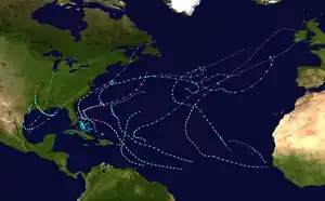 The 2019 Atlantic hurricane season officially began on June 1.[11] The season featured twenty tropical depressions, eighteen of which became tropical or subtropical storms.[21] With eighteen named storms, the season was at the time, along with 1969, the fourth most active since records began.[22] Six of those intensified into hurricanes, with three further strengthening into major hurricanes.[21] It was the fourth consecutive Atlantic hurricane season with above average activity, which last occurred from 1998–2001. Five systems developed in the Gulf of Mexico, tying with 1957 and 2003 for highest number of tropical cyclones forming in the region in a season.[23] Factors contributing to abnormally high activity included a stronger west-African monsoon, warmer than average ocean temperatures, and low wind shear, particularly over the western Atlantic and Gulf of Mexico.[11] Overall, the Atlantic tropical cyclones of 2019 collectively resulted in 116 deaths and around $11.62 billion in damage.[24] The season officially ended on November 30.[11]