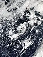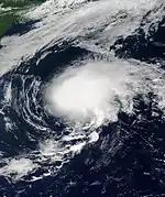 A tropical wave moved westward from Africa on August 30, organizing into a tropical depression around 18:00 UTC on September 3 about 455 mi (730 km) west of the northern Capo Verde Islands. Though the nascent tropical cyclone tracked northwest in an environment of moderate southwesterly wind shear and dry mid-level air, it intensified into Tropical Storm Gabrielle six hours after genesis. Interaction with an upper-level low further compounded negative environmental factors, causing the system to lose a majority of its convection for nearly a day. As the steering regime transitioned to be dictated by a break in the subtropical ridge, Gabrielle curved west-northwest and then north. A decrease in upper-level winds led to the formation of a well-defined inner core, and Gabrielle attained peak winds of 65 mph (100 km/h) on September 8. Thereafter, the influence of mid-latitude westerlies caused the cyclone to turn northeast and begin extratropical transition, completing it by 12:00 UTC on September 10 490 mi (790 km) northwest of the western Azores islands. The post-tropical cyclone persisted for a day before degenerating to an open trough.[70]
