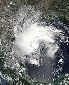 A mesoscale convective vortex formed over the Central United States on July 2 and moved slowly eastward, southeastward, and then southwestward, reaching the Gulf of Mexico about a week later. The low, which had a large area of deep convection, gradually organized, becoming a tropical depression around 00:00 UTC on July 11 roughly 190 mi (305 km) south of Mobile, Alabama. With an increase in convective banding on the south side of the cyclone's circulation, the system quickly intensified into Tropical Storm Barry just six hours later. The cyclone moved westward and then west-northwestward along the periphery of a low- to mid-level ridge. Barry's convective structure remained asymmetrical, with nearly all of the convection location south of the circulation due to wind shear and dry air. Around 12:00 UTC on July 13, Barry intensified into a hurricane and peaked with winds of 75 mph (120 km/h). Three hours later, Barry made landfall near Intracoastal City, Louisiana. The system weakened to a tropical storm later on July 13 and to a tropical depression early on July 15, before transitioning into a remnant low over Arkansas by 12:00 UTC on July 15. The low continued north-northeastward until degenerating into a trough over Missouri on the next day.[33]