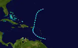 A tropical wave exited the west coast of Africa on August 19 and organized as it moved westward, becoming a tropical depression early on August 24 approximately 805 mi (1,295 km) east-southeast of Barbados. The depression quickly developed curved banding features and intensified into Tropical Storm Dorian later that day while heading west-northwestward. Dry air prevented any significant further intensification and organization for several days. Early on August 27, Dorian struck Barbados as a very compact cyclone with winds of 50 mph (85 km/h) and then passed over Saint Lucia later that day. The mountainous terrain of Saint Lucia disrupted the storm's circulation, though a new circulation formed farther to the north. Dorian resumed organizing while moving northeastward over the Caribbean, with a partial eyewall and inner core developing by August 28. The cyclone reached hurricane intensity at 15:30 UTC on August 28 while striking the eastern tip of Saint Croix in the U.S. Virgin Islands; another landfall occurred on Saint Thomas a few hours later. After emerging into the Atlantic on August 28, Dorian eventually began moving west-northwestward due to an upper-level low moving to the south and a subtropical ridge expanding westward.[27]