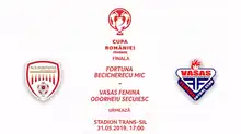 The 2019 Cupa României Final was the 16th Romanian football women's cup final, the final match of the 2018–19 Cupa României. It was played at Stadionul Trans-Sil in Târgu Mureș, on 31 May 2019, contested by Fortuna Becicherecu Mic and Vasas Femina Odorheiu Secuiesc. Vasas Femina won the match 5–0,[1] with a hat-trick from Carolina Țabur and one goal from each Rita Mitri and Krisztina Benő in only the fourth time a team has scored five goals or won by at least a five-goal margin in a cup final. The win brought Vasas its first major trophy, making it only the 7th club to win the Romanian Women's Cup.[2]
