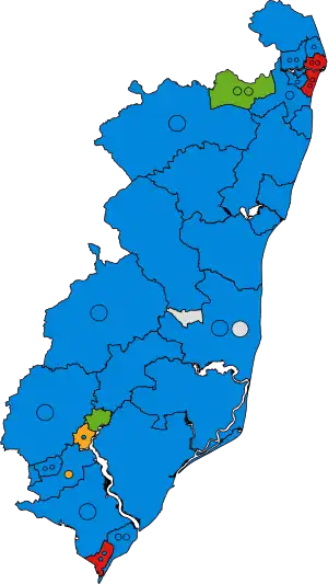 | Party | Candidates | Seats | Gains | Losses | Net gain/loss | Seats % | Votes % | Votes | +/− | |