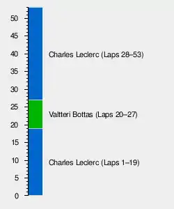 By lap 19, the top three drivers (Leclerc, Lewis Hamilton, and Valtteri Bottas, in order) were in a pit window to replace the aging soft tyres they started their races on. Hamilton was the first to do so, replacing his with medium tyres. Leclerc pitted on lap 20, but elected instead to use the longer lasting but slower hard tyre. Bottas, who also chose the medium tyre, would not pit until lap 27. All three drivers returned to racing in the same order they'd been in before their pit stops. Carlos Sainz retired from the race on lap 27, after an error fitting his right front tyre in the pits forced him to stop near the exit to pit lane; this caused a brief virtual safety car. Shortly after, Daniil Kvyat's Toro Rosso suffered a mechanical breakdown just past turn 1, causing a second virtual safety car while his car was pushed to safety.