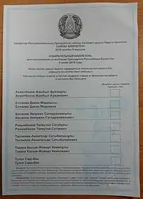 Snap presidential elections were held in Kazakhstan on 9 June 2019 to elect the President of Kazakhstan following the resignation of long-term President Nursultan Nazarbayev in March 2019.[1] This was the sixth presidential election held since Kazakhstan's independence. The elections were not free and fair, and were widely denounced as a sham. Acting president Kassym-Jomart Tokayev of Nur Otan won the election.