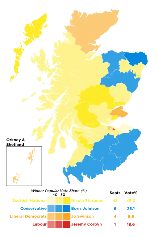 The 2019 United Kingdom general election was held on Thursday 12 December 2019,[1] two and a half years after the previous general election in June 2017. The Scottish National Party (SNP) received the most votes (45%, up 8.1% from the previous election) and won 48[n 1] out of 59 seats—a gain of 13 over those won in 2017, and 81% of the Scottish seats in the House of Commons.[2]