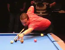 Third seed Alexander Kazakis faced Matt Edwards.[26][27] After tying at one-all, Kazakis won the next six racks to win 7–1.[28] The final quarter-final saw Skyler Woodwards defeat Albin Ouschan 7–3, with both players having been previous winners of the MVP at the Mosconi Cup.[25]