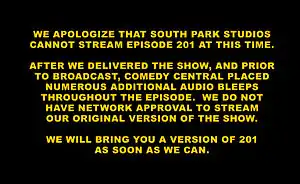 "201" has never re-aired in the United States following its original debut, as South Park would usually repeat during the week, and episodes from earlier in the season were shown instead. Although South Park Studios generally makes unexpurgated versions of their episodes immediately available to view, the notice indicated Parker and Stone did not have network approval to show their original version, and thus no version of "201" could be seen on the website.[11][21]