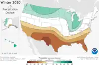 On October 15, 2020, the National Oceanic and Atmospheric Administration's Climate Prediction Center released its U.S. Winter Outlook.[3] The temperature and precipitation outlooks reflected the likelihood of a La Niña pattern developing during most of the winter. The forecast called for warmer than average temperatures across much of the southern and southwestern United States, as well as the East Coast, with cooler than average temperatures in the far northwestern United States. Near-average temperatures were expected in the Midwest. The forecast also called for drier than average conditions across almost all of the southeastern and southwestern United States, and wetter than average conditions in much of the northern tier and Midwest, with near-average precipitation in the Northeast and parts of the Midwest.[3]