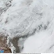 January and the new year began with a storm system moving from the Gulf of Mexico to the Northeast on New Year's Eve and New Year's Day. It produced a swath of wintry weather extending over 2,000 miles, and the system also produced up to 2 feet (24 in) of snow and over 0.5 inches (13 mm) of ice in some areas.[11] Later in the month, a storm originating in the Rocky Mountains produced a swath of wintry weather from New Mexico through Alabama, including areas such as Lubbock, Austin, Metro Houston, and Shreveport, some of which saw over 6 inches of snow accumulation.[12] Towards the middle of the month, a blizzard impacted the Midwest and the interior Northeast, producing heavy snow and extremely gusty winds behind the system.[13] During the last full week of January, a storm with winter weather spanning over 1,500 miles produced snowfall and mixed precipitation from the Midwest to the Northeast, as well as causing severe weather in the Southeast.[14][15] It was shortly followed by a cold wave in the Northeast, in which wind chills dropped to as low as −25 °F (−32 °C) and that prompted an area of wind chill advisories.[16] At the end of the month, a storm complex and atmospheric river event began to unfold in the Western United States, with snowfall totals as high as 100 inches (250 cm) and rainfall totals over a foot in many areas, causing widespread flooding and mudslides.[17] The system later became a nor'easter bringing heavy and impactful snow to both coastal and interior areas of the Northeast, with both the Boston and New York City metropolitan areas seeing 18–24 inches (46–61 cm) of snow, in addition to causing over $1.8 billion in damages.[17]