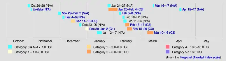 Based on the astronomical definition, winter began at the winter solstice on December 21, 2020 and ended at the spring equinox on March 20, 2021.[1] Based on the meteorological definition, the first day of winter was on December 1 and the last day was February 28.[2] However, as illustrated by the Late October ice storm and the Mid-April nor'easter, winter storms occasionally occur outside of these limits. Since both definitions of winter span the start of the calendar year, it is possible to have a winter storm in two different years, as shown by the New Year's winter storm this season. In mid-December, a powerful Category 2 nor'easter affected much of the Northeastern United States with heavy snow and ice. Over 3 ft (0.91 m) of snow was reported across a swath in the interior Northeast, and the system caused 7 fatalities. In early February, a major Category 3 nor'easter, which started out as a winter storm on the West Coast, impacted an even larger area with heavy snow, also causing 7 fatalities. In mid-February, a series of two major Category 3 winter storms brought a swath of widespread snow and ice from the Pacific Northwest, through the Deep South, and to the Northeast. In total, the two winter storms resulted in at least $27.1 billion in damage, nearly 14 million power outages, and a total of 319 fatalities. In mid-March, a historic Category 3 blizzard unfolded in the Rocky Mountains, with Denver and Cheyenne seeing one of their largest March snowstorms on record.