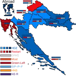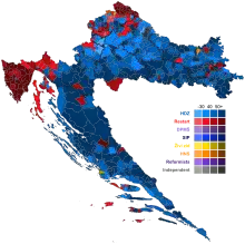 - ↑ Of the 66 seats won by the HDZ-led alliance, the HDZ won 62, the Croatian Social Liberal Party won two and the Croatian Christian Democratic Party and Croatian Democratic Alliance of Slavonia and Baranja won one each.