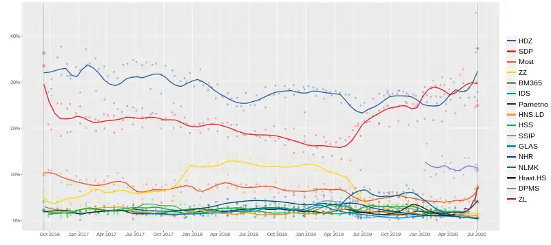 In the elections, the ruling Christian-democratic HDZ faced its main challenge from the centre-left Restart Coalition chaired by SDP leader Davor Bernardić, which consists of the SDP and several smaller parties (such as the Croatian Peasant Party, Civic-Liberal Alliance, Croatian Party of Pensioners and Istrian Democratic Assembly).[10][11] In addition, opinion polls had shown that a conservative coalition led by 2019 presidential candidate Miroslav Škoro – consisting of Škoro's own Homeland Movement party, some of the parties of the Croatian Sovereignists coalition and several other smaller right-wing parties[12] – would become the third-largest grouping in parliament, while the centre-right Bridge of Independent Lists (Most) – which finished a strong third in both the 2015 and 2016 elections, and which had supported Škoro's presidential campaign, could be reduced to the role of a minor parliamentary party. Also, the Green–Left Coalition, consisting of We Can!, the New Left, the Worker's Front, ORaH, Zagreb is OURS and For the City, entered the parliament for the first time.[13]