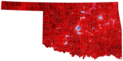 Trump easily carried Oklahoma on Election Day by a margin of 33.08%, down from 36.39 points in 2016. Oklahoma was one of two states where Trump won every county, the other being West Virginia. This also signaled the fifth consecutive election in which the Republican candidate carried every county in the state, including those counties encompassed by Native American reservations. In this election, Trump also became the first presidential candidate ever to win more than a million votes in Oklahoma.[4] Biden, however, came within 3,326 votes of winning Oklahoma's most populous county Oklahoma County, and won more than 40% of the vote in Oklahoma's second-most populous county Tulsa. No Democratic presidential candidate has won Oklahoma County since Lyndon B. Johnson in his 1964 landslide, or Tulsa County since Franklin D. Roosevelt in his 1936 landslide. This is the first election since 2000 in which not every county voted in the majority for the Republican. However, these gains in urban Oklahoma were offset by continued falloff in southeast Oklahoma, where Biden even underperformed Hillary Clinton's performance four years earlier in most counties.