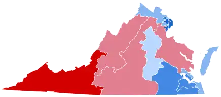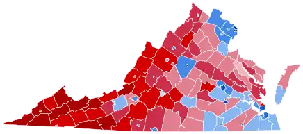 Prior to the election, most news organizations considered this a state Biden would win, or a likely blue state. On the day of the election, Biden won Virginia with 54.11% of the vote, and by a margin of 10.11%, the best performance for a Democratic presidential candidate since Franklin D. Roosevelt in 1944.[4] Trump became the first Republican incumbent to consecutively lose Virginia since William Howard Taft and Biden became the first Democratic nominee to win Chesterfield County and Lynchburg City since 1948, Virginia Beach City since 1964, James City County since 1968, and Stafford County since 1976.[5] He also flipped Chesapeake City back to the Democratic Party. Trump flipped no counties or independent cities in the state. Nevertheless, Biden became the first Democrat since 1992 to win without Buckingham County and Essex County, and the first since 1960 to win without Westmoreland County, a notable bellwether. He was the first Democrat to ever win without Caroline County, Nelson County, or Covington.