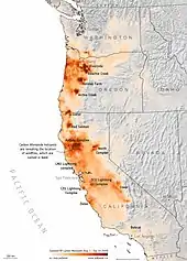 ![]() Satellite image of the smoke from the wildfires burning in California and Oregon on September 9, 2020 | |