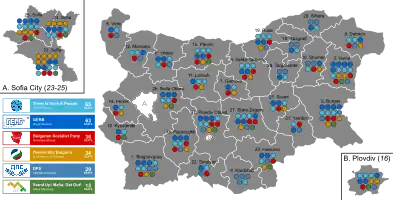 The protests saw the rise to prominence of several so called "parties of change",[7] consisting mainly of new political parties which opposed Borisov, and many of whom joined in with the protests.[8][9] The main three electoral coalitions or parties in this bloc were There Is Such a People (ITN), Democratic Bulgaria (DB) and Stand Up! Mafia, Get Out! (IMSV), and polls suggested this bloc garnered large support.[10][11]