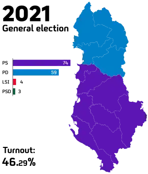 The 140 members of Parliament were elected in twelve multi-member constituencies based on the twelve counties by open list using proportional representation (using a 1% national electoral threshold) with seats allocated using the d'Hondt method.[3][4] Significant changes to the electoral system were made a year before the 2021 elections by the Albanian parliament by amending several articles of the constitution. The ruling Socialist Party was accused by the united opposition, which two years earlier had left parliament and had not participated in the 2019 local elections, of violating the electoral law agreement they had previously agreed on.[5] The majority defended itself by saying that the changes were made as a request of public opinion for the opening of the lists of deputies so that each voter chooses his preference. And that with the new system, Albania introduces a system well known and implemented by some European countries, such as Croatia, Slovenia, the Netherlands or Estonia, and moving away from the old system that was unique in its kind and that is not applied elsewhere - even though a number of European countries use closed-list proportional representation.[6]