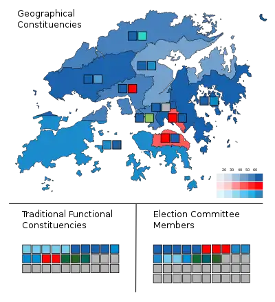 As expected, most seats were won by the pro-Beijing camp, with only one non-establishment candidate being elected (Tik Chi-yuen in the Social Welfare functional constituency).[124] Turnout was 30.20%,[125] the lowest in the history of legislative elections.[126] Over 2% of ballots cast were blank or invalid.[127]