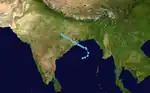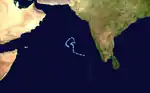 On November 3, a low pressure area entered into the Arabian Sea,[129] which formed over south-central Bay of Bengal on October 27.[130] The low pressure area later organized into a well-marked low pressure area on November 6, as the system gradually moved northwards.[131] On the next day, conditions became more favourable for further intensification, like further intensification of the MJO index, warm sea-surface temperature and moderate wind shear. Thus the system further intensified into a depression at 06:00 UTC (11:30 IST).[132] However, conditions did not allowed the system for further intensification. Thus, at 03:00 UTC (08:30 IST) of November 9, the IMD downgraded it to a well-marked low pressure area.[133] The JTWC also tracked the system, from 18:00 UTC (23:30 IST) of November 4 while located at 537 nautical miles (995 km; 618 mi) to the south-southwest of Mumbai until the same time of November 6.[134][135]