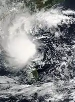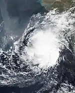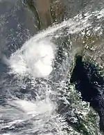 On May 14, a depression formed in the Arabian Sea off the coast of Kerala.[3] The JTWC began monitoring the depression, and designated it as Tropical Cyclone 01A.[4] The system gradually intensified, before intensifying into a Deep Depression by 12:00 UTC (17:30 IST) that day.[5] Around 18:00 UTC (23:30 IST) that day, the system intensified into a Cyclonic Storm, and it was given the name Tauktae by the IMD.[6][7] The name Tauktae was contributed to the naming list by Myanmar, and it means gecko in the Burmese language.[8] It later intensified into a Severe Cyclonic Storm at 15:00 UTC (20:30 IST) in May 15.[9] Tauktae's intensification was unusual as it intensified from a depression to a severe cyclonic storm over a period of just two days, with equivalent storms generally taking four to five days to intensify into a severe cyclonic storm.[10] Three hours later, the JTWC upgraded Tauktae to a Category 1-equivalent tropical cyclone on the Saffir–Simpson scale.[11] Tauktae further intensified into a Very Severe Cyclonic Storm at 00:00 UTC (05:30 IST) May 16.[12] At 06:00 UTC (11:30 IST) that day, the JTWC upgraded the storm further to a Category 2 tropical cyclone.[13] INSAT imagery showed that the cyclone had developed an eye by 09:00 UTC (14:30 IST).[14] However, the eye had started to degrade by 15:00 UTC (20:30 IST), according to INSAT imagery, and remained ragged for the rest of the storm's lifetime.[15]