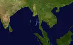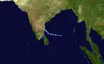 On November 12, a cyclonic circulation persisted over the Gulf of Thailand and the adjoining Malay Peninsula,[148] which on the next day became a low pressure area by the IMD and Invest 92B by the JTWC.[149][150] The IMD and the JTWC previously forecasted that it would become a depression by November 15 and further intensify on November 18 as it reaches the coast of Andhra Pradesh.[149][150] However both the agencies downgraded to nil chance of becoming a depression on November 15, because of a formation of another low pressure system over the Arabian Sea and the formation of a trough to the south of the system over the east of the equatorial Indian Ocean, which blocked the inflow of warm moist winds to the center of the system.[151][152] As the low pressure area meandered westwards towards the Tamil Nadu coast, the system rapidly intensified into a depression by 07:00 UTC (12:30 IST) of November 18, as its convection rapidly consolidated and formed a distinct low-level center. By the same time, the JTWC issued a TCFA on the system and started to retrack.[153][154] Between 21:30 and 22:30 UTC (03:00 and 04:00 IST) of the same day, the depression crossed north of Pondicherry,[155] and by 08:00 UTC (13:30 IST) the system weakened into a well-marked low pressure area.[156] The JTWC cancelled the TCFA as it made landfall.[157]
