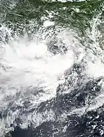 On September 11 at 00:00 UTC (05:30 IST), under an influence of a cyclonic disturbance, an area of low pressure had formed over the east central and the adjoining northeastern Bay of Bengal, which later intensified into a well marked low pressure area, a day later. At 12:00 UTC (17:30 IST) the same day, it further concentrated into a depression as it approached the coast of Odisha. Conditions like low to moderate vertical wind shear, warm sea-surface temperature and strong pulse of Madden Julian Oscillation helped the system's intensification to a depression. Due to the prevailing monsoonal trade winds, the system moved west-northwestwards for the rest of its lifetime.[67][68] As the system was about to make landfall near Chandbali, Odisha, it further concentrated deep depression at 00:00 UTC (05:30 IST). At the same moment it crossed near Chandbali between 00:00 UTC and 01:00 UTC (05:30 IST and 06:30 IST) as a deep depression. After crossing, it weakened into a depression over the border of Chhattisgarh and Odisha, at 03:00 UTC (08:30 IST) the next day, but it managed to maintain its intensity for the rest of its lifetime, because of the prevailing monsoonal conditions. This unusual phenomenon is called the brown ocean effect.[69][68] It continued to move on its trajectory, until at 00:00 UTC of September 15, it further weakened into a well-marked low pressure area over northeastern Madhya Pradesh and its neighbourhood.[68] The JTWC didn't tracked the system, but they did monitored as an invest.[70]