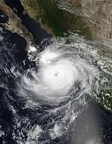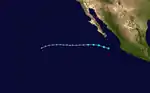 On July 26, the NHC noted a disturbance located about 700 miles (1,125 km) south-southwest of the southern tip of Baja California. The system moved parallel to another disturbance which later became Hurricane Hilda.[50] By 21:00 UTC on July 30, the disturbance attained a well-defined center of circulation with sufficient organized convection and was classified as a tropical depression, bearing the designation Nine-E.[51] The depression was initially forecast to become a tropical storm, but failed to do so due to dry air and wind shear caused by nearby Hurricane Hilda. Early on August 1, the system degenerated into a remnant low.[52] Even though Nine-E was a tropical low, the NHC still monitored the system for further development[53] On August 4, it re-intensified into a tropical depression again while maintaining two rainbands in a slightly elongated circulation.[54] On the next day, at 09:00 UTC, the depression intensified into a tropical storm, with the NHC naming it as Jimena, as the storm's deep convection had increased near the low-level center and based on satellite imagery, the storm was producing tropical storm force winds.[55] The convection later diminished on August 6, as it moved over cooler sea-surface temperatures and encountering high wind shear and dry airmass. However, despite all this, Jimena managed its intensity, as it continued to produce tropical storm force winds, based on ASCAT data.[56] A deep convective mass also continued to persist over the center of Jimena.[57] At 21:00 UTC, the NHC issued its last advisory, downgrading the system to a tropical depression as it entered the CPHC's area of responsibility. Its deep convection weakened significantly as it moved over cool sea surface temperatures causing Jimena to weaken.[58] The CPHC later issued its only bulletin for Jimena at 03:00 UTC the next day, stating that Jimena had become a post-tropical cyclone as its deep convection had collapsed completely.[59]