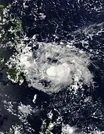 Dujuan briefly moved over Palau on February 16 as a tropical depression, bringing heavy rainfall to parts of the country.[17][18] Classes and government work were suspended on February 22 in parts of Eastern Visayas and Central Visayas, including Surigao del Sur.[19][20] A total of 242,194 individuals were affected in Northern Mindanao, Caraga, and in the Davao Region. At least 77,811 of the affected individuals were taken to 344 various evacuation shelters in each region. One person was reported dead with four others reported missing, with total damages to agriculture and infrastructure amounting to 159.8 million (US$3.29 million).[21]