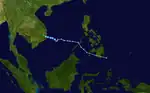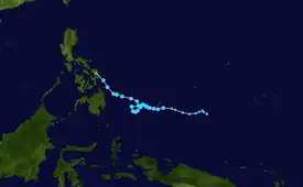 On May 11, the JTWC noted a persistent area of convection in the Philippine Sea, approximately 184 nmi (341 km) west of Palau.[41] The JTWC issued a TCFA for the convection on May 12, as it further developed in an environment with low vertical wind shear and warm sea surface temperatures.[42] Just three hours later, the agency recognized that the area of convection had quickly consolidated into a tropical depression and assigned it with the identifier of 03W.[43] Around the same time, the JMA had also recognized the storm as a tropical depression while it was to the east of Mindanao.[44] Since the storm developed within the Philippine Area of Responsibility, the PAGASA immediately named the storm Crising once the agency recognized it as a tropical depression as well, and later raised Signal No. 2 warnings for areas in Mindanao.[45][46] In the early hours of May 13, the JTWC upgraded the system into a tropical storm, with the PAGASA following suit hours later.[47][48] Later that day, Crising's low-level circulation center became exposed due to wind shear, and it lost organization. At 8:20 p.m. Philippine Standard Time (12:20 UTC), Crising made landfall in Baganga, Davao Oriental as a weakening tropical storm. It quickly degraded as soon as it made landfall, with both the JTWC and the PAGASA downgrading it to a tropical depression at 15:00 UTC.[49][50] At 03:00 UTC on that day, the PAGASA reported that the system degenerated to an area of low-pressure in the vicinity of Piagapo in Lanao del Sur, thus lifting all warning signals on Mindanao and issuing their final advisory.[51] On May 14, the system dissipated over the Sulu Sea, and both the JMA and the JTWC issued their final advisories on the storm.