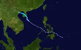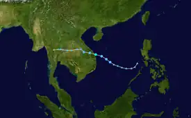 On June 10, the JTWC started to monitor an area of low-pressure in the South China Sea, approximately 518 km (322 mi) to the south of Hong Kong, with the agency classifying the system as a monsoon depression.[85] Tracking west-northwestward, the storm was located in a favorable environment for further development, with warm sea surface temperatures and low wind shear.[86] At 00:00 UTC on June 11, the JMA upgraded the system into a tropical depression.[87] Six hours later, the JTWC issued a TCFA for the system as it began to show characteristics of a monsoon depression.[88] By 18:00 UTC, the JMA upgraded the system to a tropical storm, assigning it the name Koguma.[87] On June 12 at 00:00 UTC, the JTWC upgraded Koguma to a tropical depression, assigning it the designation 05W.[89] Later that day, the JTWC also upgraded Koguma to a tropical storm.[89] By June 12, it had made landfall southeast of Hanoi,[90] and dissipated the next day.[87]