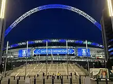 Wembley Stadium in London lights up blue and white to celebrate Sheffield Wednesday's promotion.