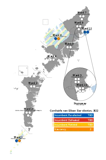 Elections to Comhairle nan Eilean Siar (Scottish Gaelic for 'Council of the Western Isles') took place on 5 May 2022 on the same day as the 31 other Scottish local government elections. The election was the first to use the nine wards created under the Islands (Scotland) Act 2018 which allowed for single and dual member wards, with 29 councillors being elected. Each ward elected either 2, 3 or 4 members, using the Single Transferrable Vote electoral system, a form of proportional representation.[2] Following a boundary review the number of wards will increase from nine to 11 while the number of councillors elected will fall from 31 to 29.