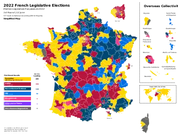 Legislative elections were held in France on 12 and 19 June 2022 to elect the 577 members of the 16th National Assembly of the Fifth Republic. The elections took place following the 2022 French presidential election, which was held in April 2022.[1] They have been described as the most indecisive legislative elections since the establishment of the five-year presidential term in 2000 and subsequent change of the electoral calendar in 2002.[2] The governing Ensemble coalition remained the largest bloc in the National Assembly but substantially lost its ruling majority, resulting in the formation of France's first minority government since 1993.