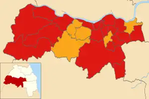 22 out of 66 seats to Gateshead Metropolitan Borough Council 34 seats needed for a majority | ||||||||||||||||||||||||||||||||||