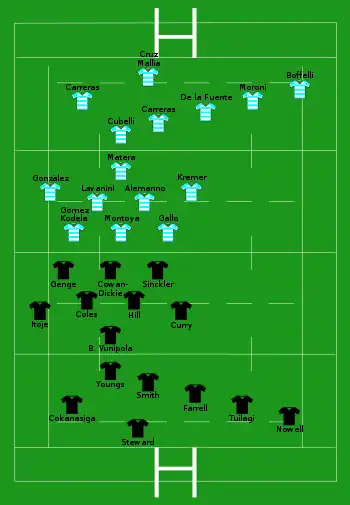 | Try: Tuipulotu (2) 11' c, 55' c Van der Merwe 24' c Graham (3) 28' m, 42' m, 77' c Redpath 68' c Hogg 74' c Con: Russell (6/8) 12', 24', 56', 70', 75', 79' | Report | Try: De la Fuente (3) 16' m, 39' c, 80+7' c Boffelli 52' c Con: Boffelli (2/3) 40', 53' Sanchez (1/1) 80+8' |