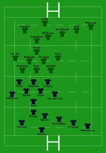 | Try: Quattrin (2) 10' c, 49' c Thomas (2) 18' c, 28' c Con: Coats (4/4) 11', 19', 29', 50' Pen: Coats (3/3) 2', 66', 77' | Report | Try: A. Ludick 7' c Ludwig 22' m Van der Westhuizen (2) 37' c, 72' m Deysel 39' m Van den Berg 63' m Kisting 80+1' c Con: Loubser (2/4) 8', 38' Kisting (2/3) 73', 80+2' |