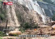 As downpour continued, landslides rocked the city. In the neighbourhood of Shau Kei Wan, giant boulders as large as a bus tumbled down a section of the road, some 50 meters of the road was completely covered with mud and rocks standing up to three meters high.[14][15] Luxury houses in Redhill Peninsula near Tai Tam Bay were also exposed with illegal structures following the soil slip.[16][17] Ruptures of underground water pipe created sinkholes in several part of the city, causing minibus and car plunging into the holes.[18][19]