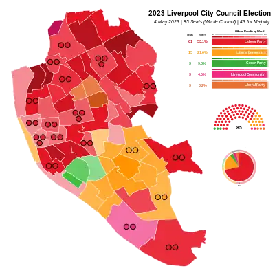 ![]() Map showing the results of the 2023 Liverpool City Council election | |||||||||||||||||||||||||||||||||||||||||||||||||||||||||||||||||||||||||||
