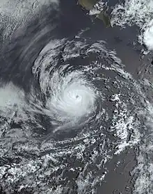 A tropical wave which the NHC had been monitoring since July 16 crossed over Central America into the Eastern Pacific on July 29, off the coast of El Salvador, producing a large area of rain and thunderstorms amid a favorable environment.[64] The system became better organized on July 31, and Tropical Depression Five‑E developed that afternoon.[65] Deep convection increased within the depression, and it strengthened into Tropical Storm Dora early the following day.[66] During August 2–3, Dora rapidly intensified to Category 4 strength, far to the southwest of Cabo San Lucas, Baja California Sur. Then, after undergoing an eyewall replacement cycle,[67] and weakening to a Category 3, it re-intensified to Category 4, with sustained winds reaching 140 mph (220 km/h) early on August 4. Later that day and into the next, the system weakened to Category 2, with winds dropping to 105 mph (165 km/h), before rebounding. Dora reached Category 4 for a third time on August 5, with sustained winds of 145 mph (230 km/h).[20] At 15:00 UTC the next day, Dora, experiencing a slight fluctuation in intensity, crossed over into the Central Pacific basin.[68] Later, on the morning of August 9, Dora strengthened once again, generating winds of 145 mph (230 km/h) amid a low-shear, warm sea surface temperatures environment. It continued to display annular characteristics, with a well-defined, symmetrical 9.2-mile-wide (15 km) eye, surrounded by a compact central dense overcast of less than 120 miles (190 km) wide.[69] At 21:00 UTC on August 11, Dora weakened to Category 2 strength about 900 mi (1,450 km) south of Midway Island.[70] It then crossed the International Date Line a few hours later, and was reclassified as Typhoon Dora.[71][72]
